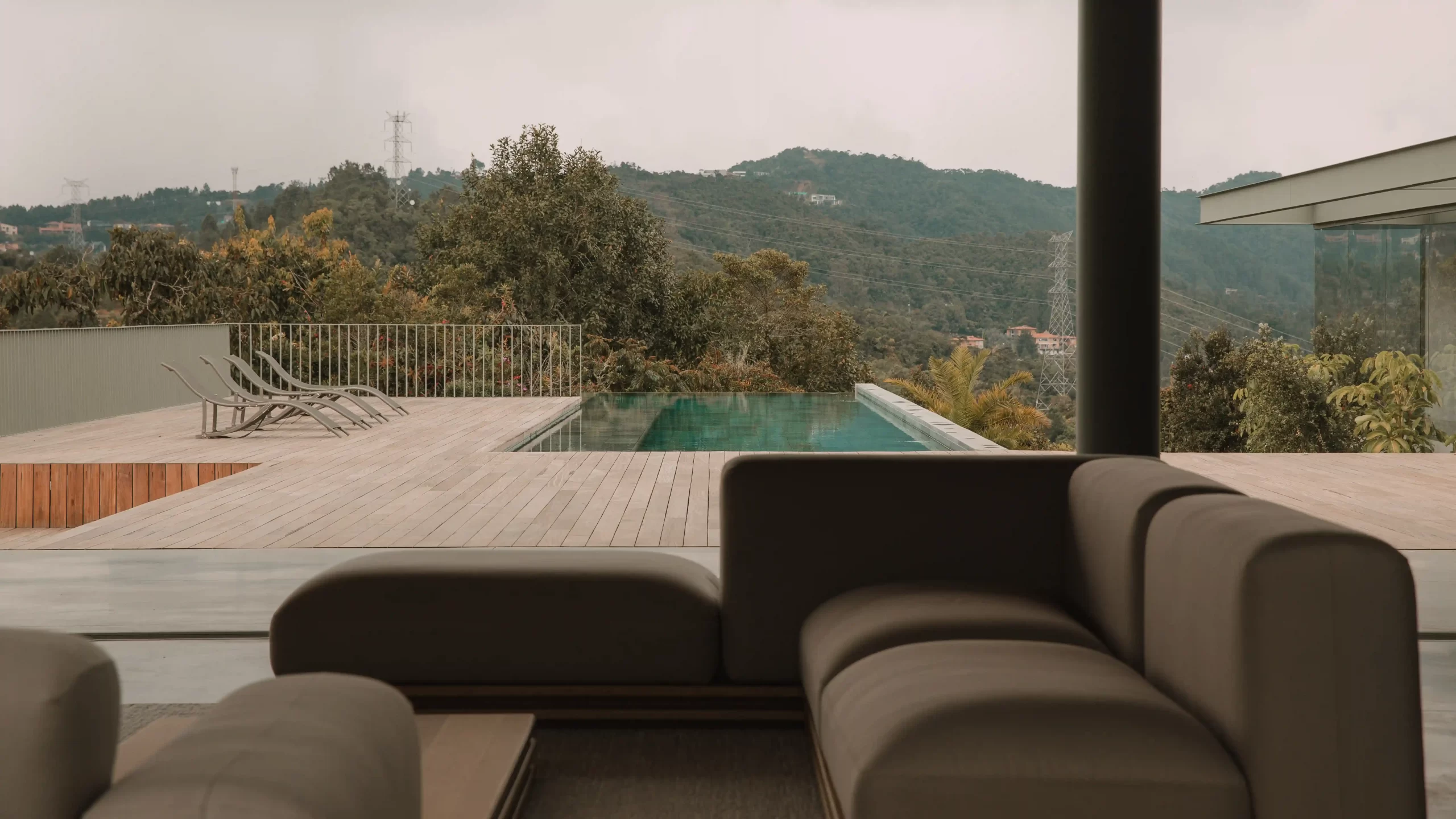 Piscina con playa y efecto sin fin, diseñada para fundirse con el paisaje. Sus escalas integradas y el porcelanato Tresor Bali realzan el tono natural del agua, creando un ambiente sereno y sofisticado.