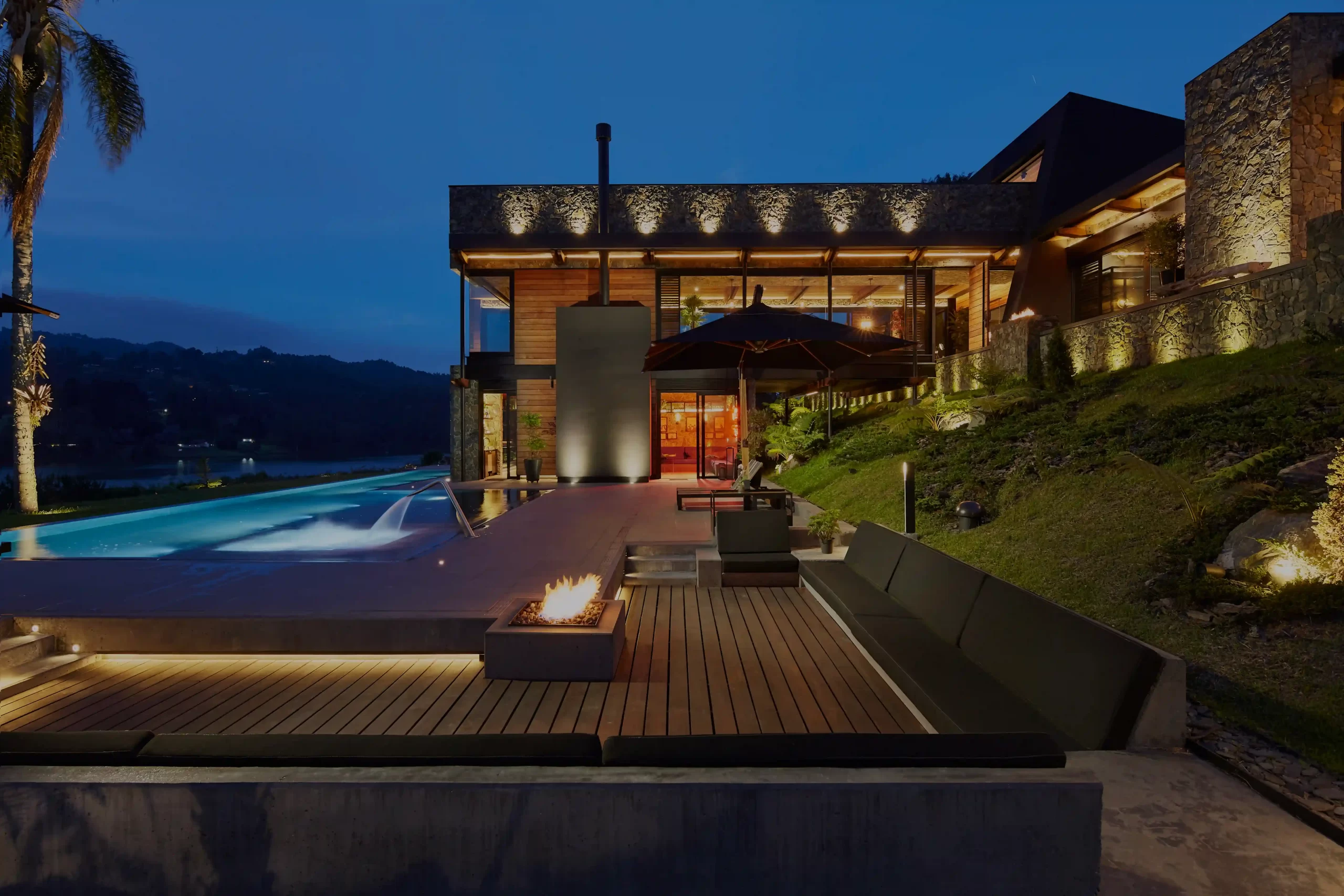 Piscina desbordante con efecto sin fin y spa incorporado, con porcelanato tao grey en el exterior y mosaico vitreo en el interior, cañon, sauna y spa de la colección highlife empotrado